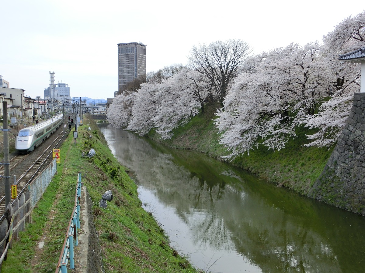 3、満開の霞城公園と山形新幹線「つばさ」(山形市)