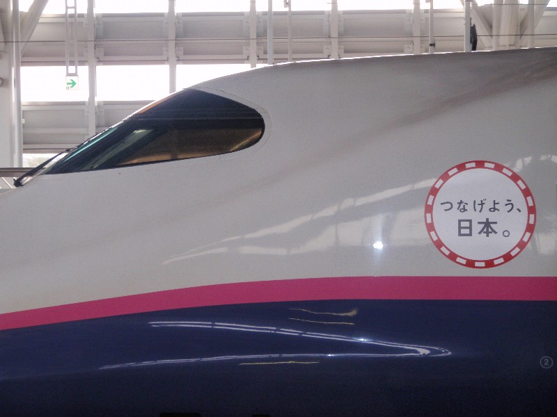 東北新幹線「はやて」の車両にも「つなげよう、日本。」のステッカーが貼られています。