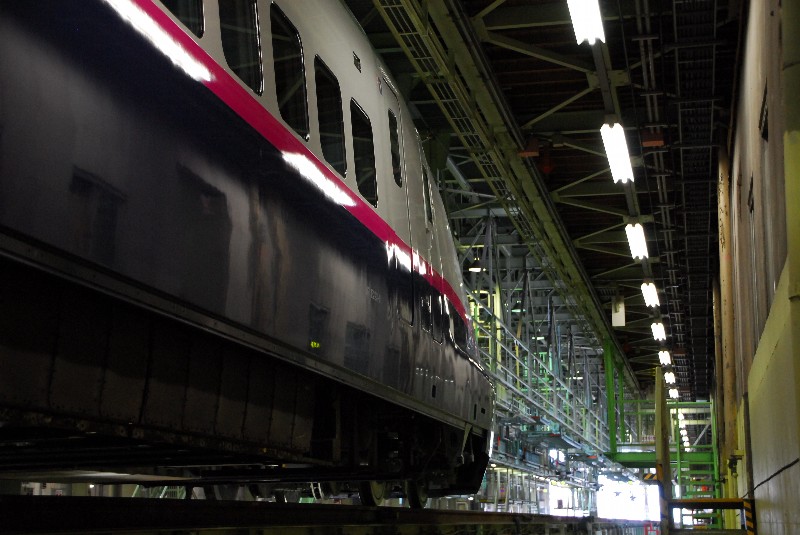 カラーリングはこの工場に保存されるまで、東海道新幹線と同じ青帯だったようです。