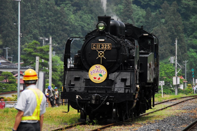 牽引するC11形のSLは石炭、水を積むテンダー車が無い小さな機関車。