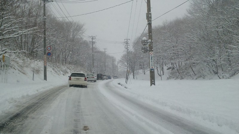 スキー場への道は20cmほどの積雪・・・朝方に降った雪は除雪が間に合わずにワダチや圧雪状態。